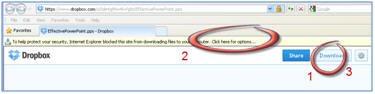 PowerPoint click the Download button (1), and if the yellow bar appears above the DropBox logo, follow 'click here for options' and choose the download option (2), then choose the Download button again (3) ³PowerPoint SlideMaster