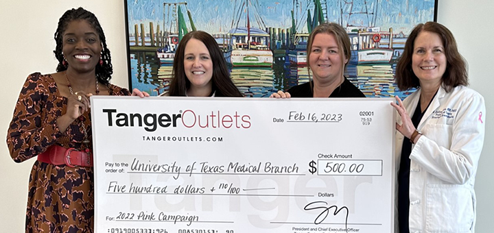 UTMB Health was awarded a $500 donation for the 2022 Partners in Pink Campaign and $20,000 for the 2022 Bra Dazzle. The Bra Dazzle event helps to provide breast cancer screenings with the UTMB Mobile Mammography program for our uninsured and underinsured patients. The Pink Campaign raises awareness of Breast Cancer research and mammogram screening. The checks were presented to Dr. Angelica Robinson, Dr. Colleen Silva, and other prestigious colleagues.