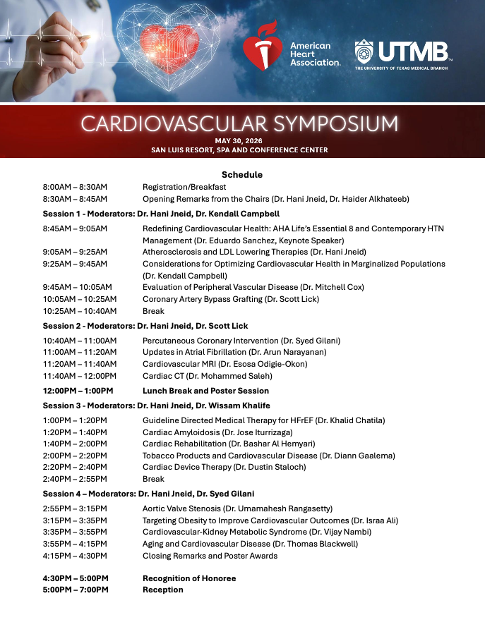 The American Heart Association and the Department of Cardiovascular Medicine and Sealy Heart & Vascular Institute at The University of Texas Medical Branch are partnering to host the second annual Cardiovascular Symposium on Saturday, May 30, 2026 at the San Luis Resort, Spa & Conference Center! The CME/CNE-accredited event will be from 8:00am to 5:00pm, with an award reception to follow.