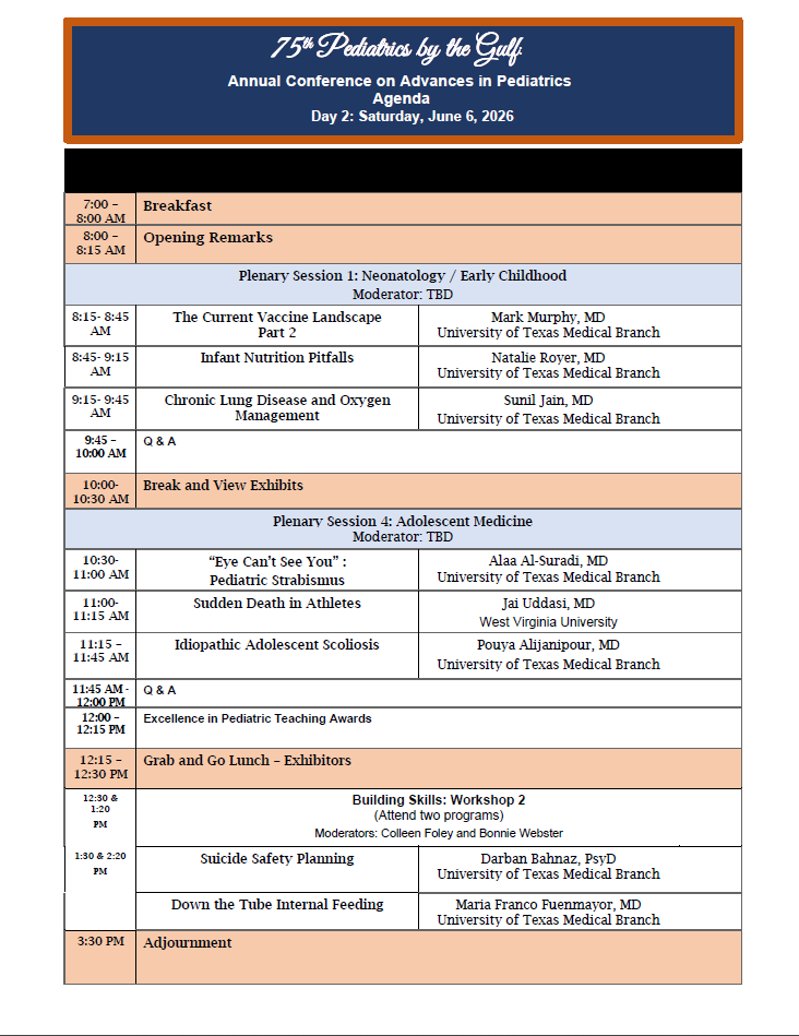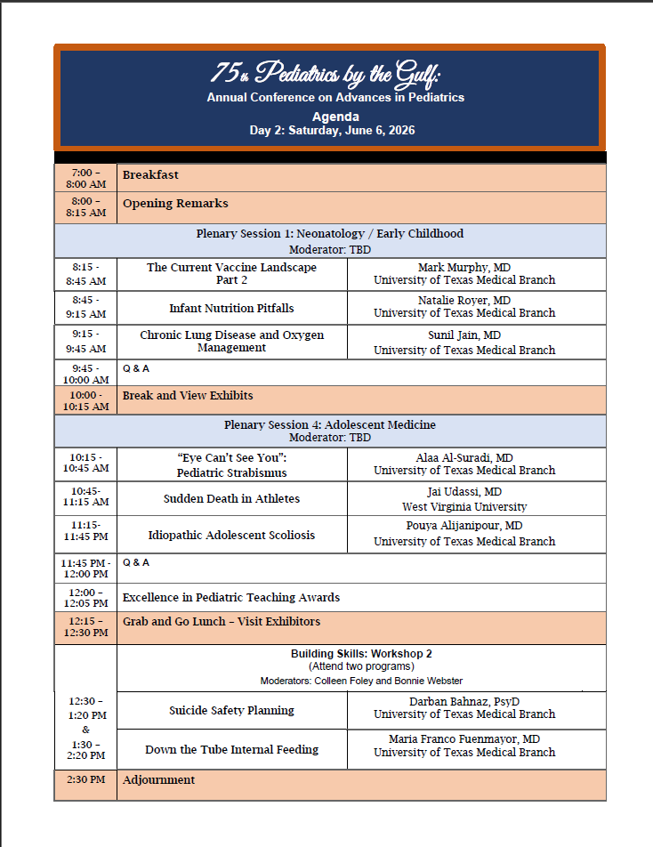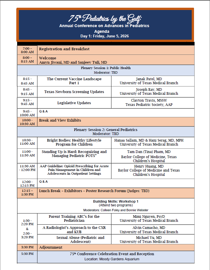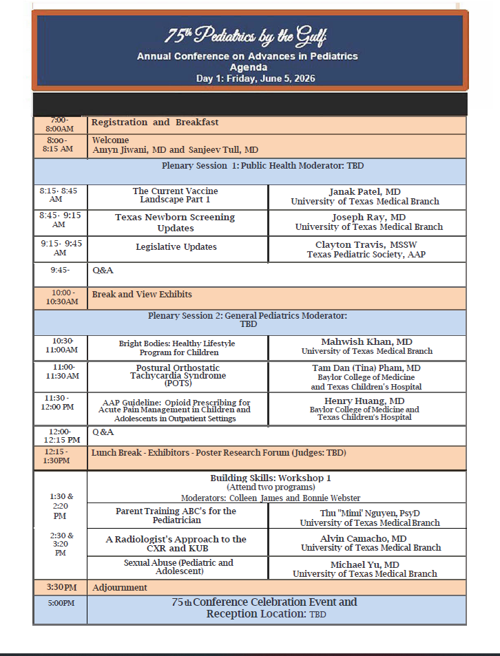 PROGRAM Skip Menu Navigate: Select to Navigate... - Pedi By the Gulf - PROGRAM - PLANNING COMMITTEE - POSTER SYMPOSIUM - ACCREDITATION - REGISTER Pedi By the Gulf PROGRAM PLANNING COMMITTEE POSTER SYMPOSIUM ACCREDITATION REGISTER ConferenceCheck-in time is 4 p.m. and check-out is noon Check out the best things to do in Galveston Here!Galveston Island Calendar of Events Galveston Island