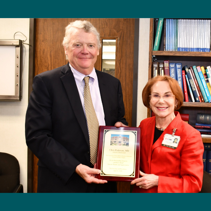 UTMB Department of Surgery News The Division of Plastic Surgery welcomes visiting professor Dr. Chris Pederson April 9, 2026, 13:07 PM by John Carstens The Division of Plastic Surgery was honored to host Dr. Chris Pederson, MD, as a visiting professor. UTMB launches feasibility study of new device used during lumpectomy procedures April 3, 2026, 12:21 PM by Katherine Adams, UTMB Marketing and Communications UTMB is enrolling patients in a U.S. feasibility study evaluating the investigational SIRA radiofrequency ablation device, an innovative technology designed for use during breast‑conserving surgery. Congratulations to Debra Burkley on National Award Nomination! March 10, 2026, 09:28 AM by John Carstens Debra Burkley was nominated for the 2026 Program Coordinator Excellence Award. The Division of Plastic Surgery welcomes visiting professor Dr. Cristiane Ueno March 6, 2026, 08:24 AM by John Carstens The Division of Plastic Surgery was honored to host Dr. Cristiane Ueno, MD, as a visiting professor. Division of Plastic Residents NEW Office Space March 2, 2026, 14:18 PM by John Carstens Division of Plastic Residents NEW Office Space